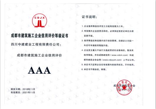 按照《成都市建筑業協會建筑施工企業信用評價管理辦法》、《關于繼續開展協會建筑施工企業信用評定工作的通知》,經專家組考評及復審確定,我公司被成都市建筑業協會評為:成都市建筑施工AAA級信用企業。 ...